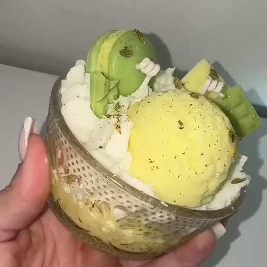 ✨ Design: Chantilly blanche, boule de glace jaune, macaron vert citron, et touches décoratives.