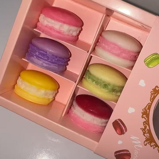 Ce coffret raffiné renferme six macarons parfumés, soigneusement réalisés à la main, dans une boîte élégante pour une présentation irrésistible.
